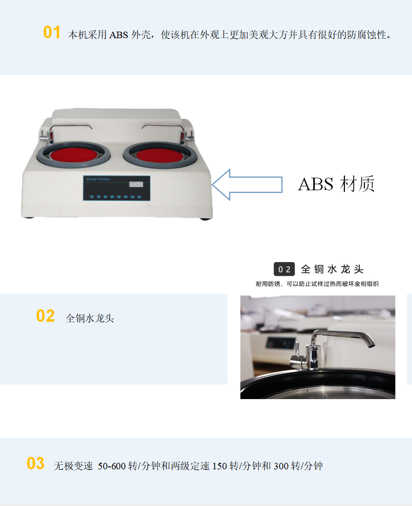 本磨拋機(jī)由底座、電機(jī)、磨拋盤及控制面板等組成。本機(jī)采用ABS外殼,使該機(jī)在外觀上更加美觀大方并具有很好的防腐蝕性。